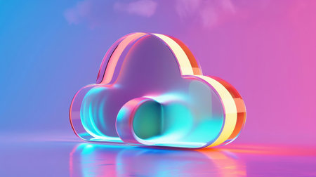 An abstract representation of a cloud is presented with a gradient color scheme. The object reflects light, suggesting a polished or glassy texture, and is set against a neutral backdrop. It could be used in various commercial projects to symbolize technology or digital concepts.