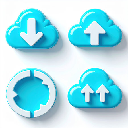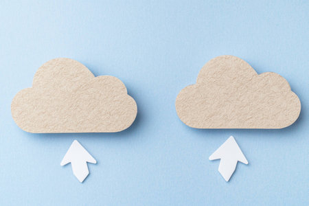 Minimalist cloud icons on a light blue background representing digital storage and data transfer concepts with arrows