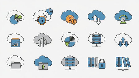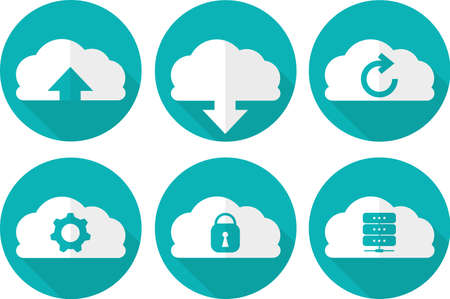 A collection of flat design icons depicting cloud computing services, data storage, management, and security.