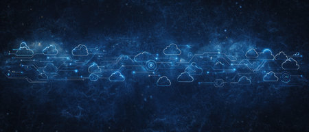 A dark blue background with digital cloud icons and data flowchart lines in the foreground, representing technology's role in virtual office system management. The design is sleek and modern, perfect for creating an online or marketing graphic related to network systems or remote work for your brand. This is an ultra-realistic photograph captured using a high-resolution 3D render with natural lighting, in the style of Canon EOS-1D X Mark III. --ar 7:3 --v 6.1 Job ID: a761daa7-a440-4bfd-9b39-b2bd0ef4bfed