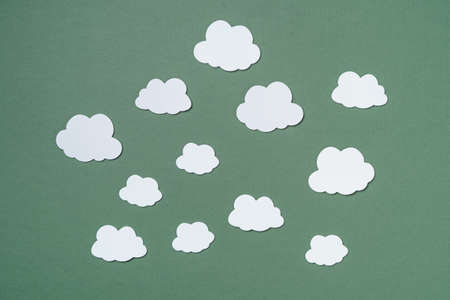 Elements in shape of white clouds on paper green background. Greeting card design. Flat lay. Top view