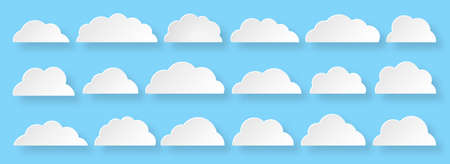 White paper cut vector cloud set. Clouds cartoon symbols on blue background with shadow for web site design, app. Bubble icon collection for infographic design. Label and stickers