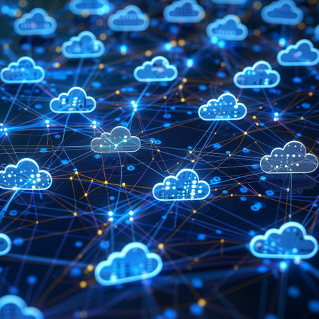 Cloud computing connectivity visualized with nodes and data paths highlighted on a digital map depicts network structure