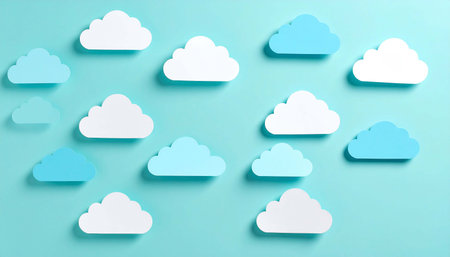 A pastel blue background features numerous paper clouds in varying shades of white and light blue, arranged in a scattered yet balanced composition, casting subtle shadows