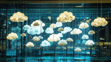 This captivating cloud installation features a series of illuminated cloud shapes, suspended in air, creating a serene atmosphere perfect for modern interior settings.