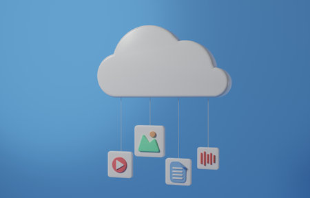 Cloud computing, cloud data storage, company keeping and backing up important files in secure cloud system concept, 3d render illustration.