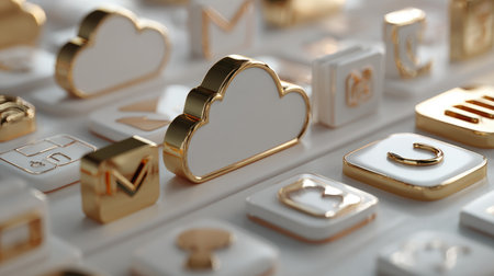 A collection of stylish gold and white icons arranged on a sleek background, ideal for showcasing modern technology and application designs.