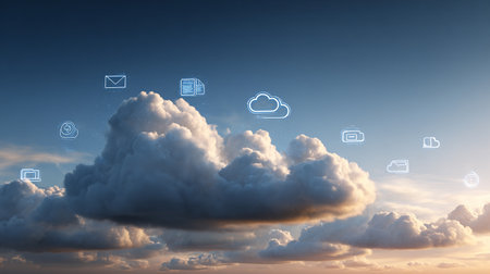 Abstract cloud filled with colorful icons representing technology and social media against a serene sky background, ideal for digital communication themes