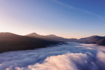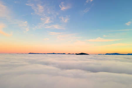 Beautiful foggy sunrise landscape from drone. Magical sunrise over the clouds.