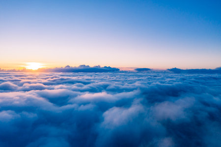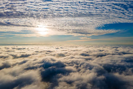 Beautiful sunrise over cloudy sky. View from the drone above the clouds.