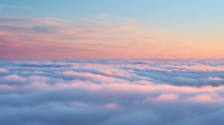 Above showing sunrise sun rays breaking through clouds with soft pink and orange hues creating a serene and ethereal atmosphere above a layer of fog or low clouds....