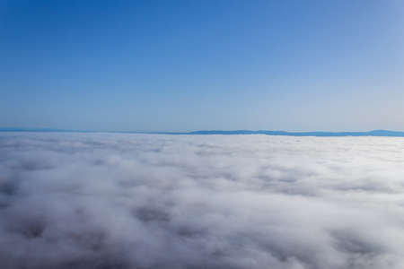 Above the clouds, sunrise or sunset. clear sky over fog. view from the plane. Concept, travel, vacation. relax.