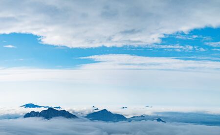 Mountain peaks covered with clouds during sunset. Beautiful alpine highlands landscape. Copy space.