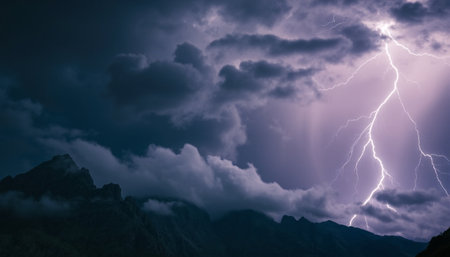 A breathtaking view of a lightning bolt striking the mountains during a thunderstorm, showcasing the raw power of nature with dark storm clouds and illuminated landscape.