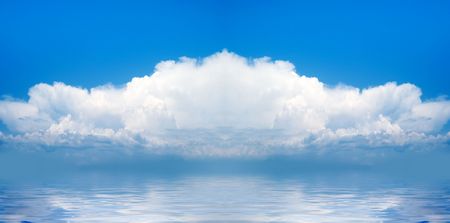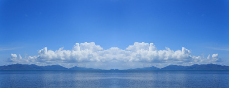 Spectacular blue and white panoramic cloudscape with clear water reflections. Photgraph was shot at sea from the deck of a boat looking toward land.cloud, reflections, water, panorama, scene, scenic, view, bright clouds, sky, colourful, blue, white, clou