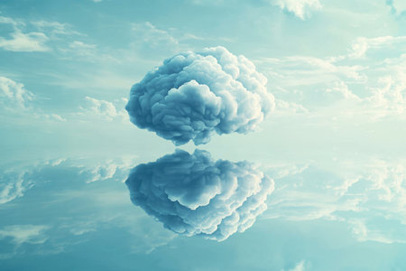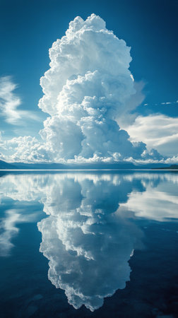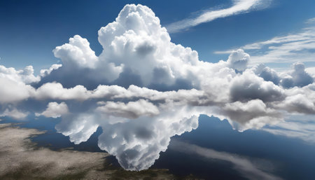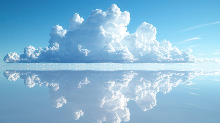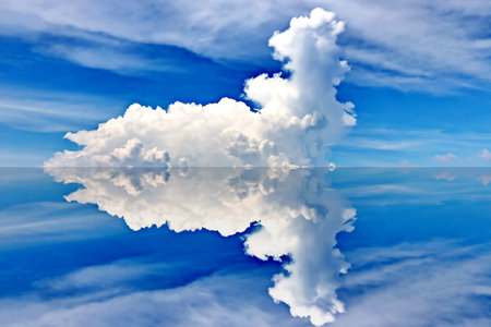 A large cloud floating in the sky above a calm body of water. The cloud is surrounded by a blue sky and the water is still and reflective. Concept of tranquility and peace