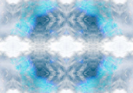 Blue sky background with white clouds. Abstract kaleidoscope fabric design.