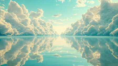 Blue sky background with clouds reflected in water. 3d illustration.