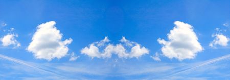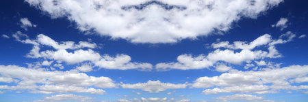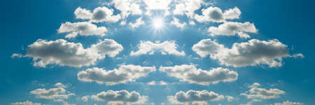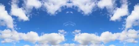 Panoramic sky background. White clouds blue sky background. White cumulus clouds texture.
