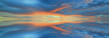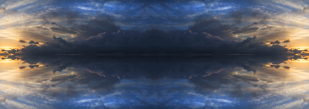 Large panorama image of stormy sunset sky reflected in still water