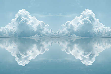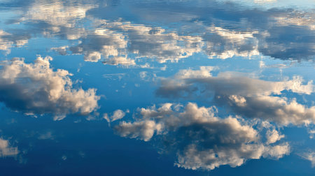 Stunning view of fluffy clouds reflected on a serene water surface, showcasing a bright blue sky and a sense of tranquility and peace in nature.