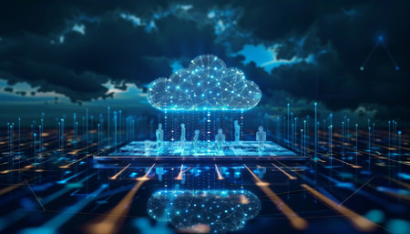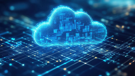 This image showcases a digital cloud concept, visualized in blue tones. It embodies modern technology and data transmission against an abstract background.