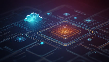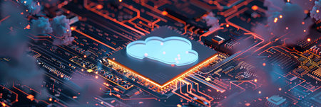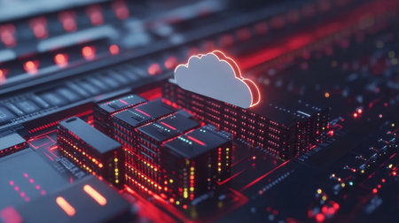 A vibrant representation of cloud computing technology featuring illuminated data centers on a circuit board, showcasing innovation in digital systems and connectivity.