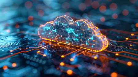 Abstract glowing orange cloud symbol over circuit board, representing cloud computing and digital data storage in a futuristic tech scene.