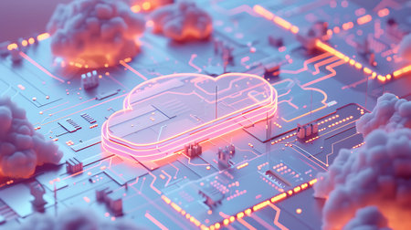 Cloud computing digital concept with neon circuitry and 3d rendered clouds
