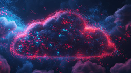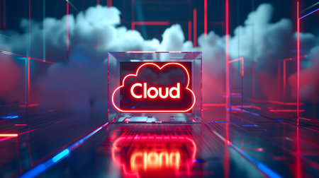 A 3D illustration of a cloud computing network, depicting data storage and digital transformation. Neon lights illuminate the scene.