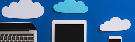top view of empty paper clouds near laptop, smartphone and digital tablet with blank screen isolated on blue, panoramic shot
