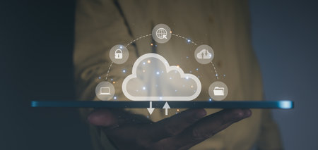 Businessman hand holding access cloud computing technology. Data storage security online in Networking and internet service. Connect devices to cloud. Cloud computing concept.