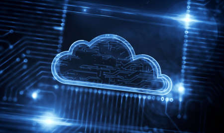 Cloud computing technology and online data storage for business network concept. Computer connects to internet server service for cloud data transfer presented in 3D futuristic graphic interface.