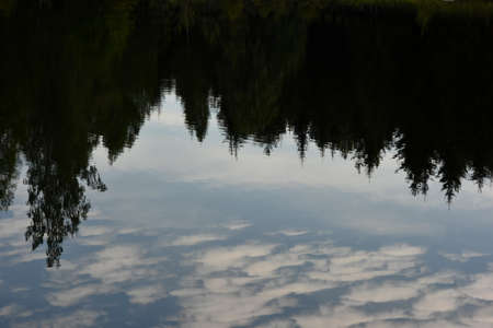 Dark forest and sky reflecting in the calm water. Reflection in water, mirror effect