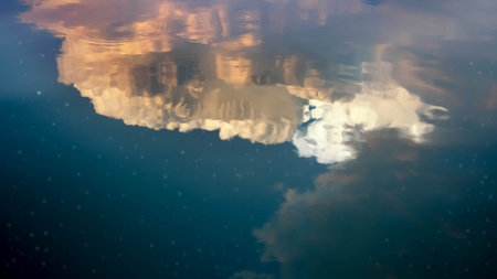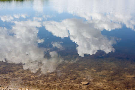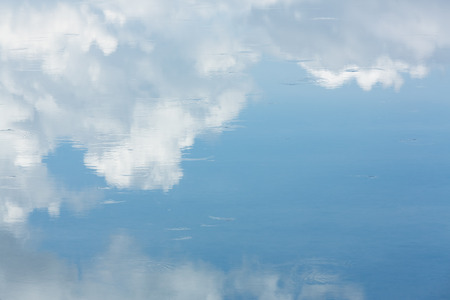 reflection of blue sky with white clouds in water, abstract background.