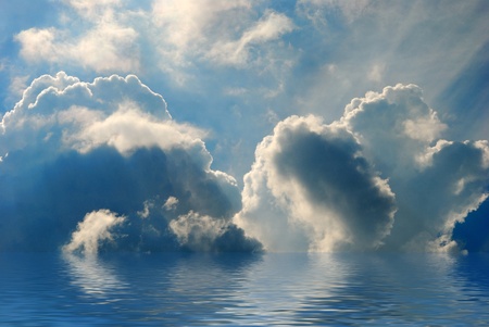 Spectacular blue and white panoramic cloudscape with clear water reflections. Photgraph was shot at sea from the deck of a boat looking toward land.cloud, reflections, water, panorama, scene, scenic, view, bright clouds, sky, colourful, blue, white, clou