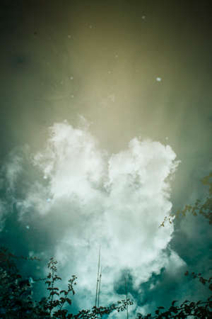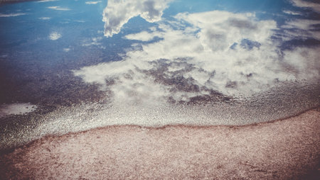 Reflection of clouds in the water of a lake, vintage filter