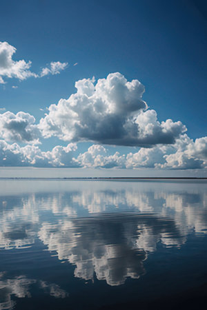 Reflection of blue sky and white clouds on the water surface.