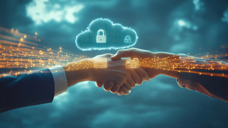 A handshake between two business people with a digital, cyberpunk-inspired background, symbolizing the beginning of an IT-driven joint project in technology and security. The scene is set against glowing data streams representing cloud storage or abstract network connections. A mix of orange and blue colors creates energy and focus on global communication. In the foreground, there are visible tech symbols like lock iconography for crossed technological collaboration. --chaos 30 --ar 16:9 --v 6.1 Job ID: c11a3bf8-9cdd-4662-abcf-e35fc8927029