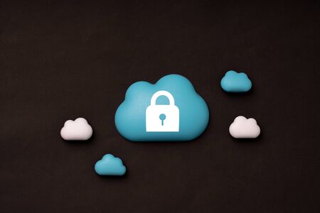 A white cloud icon with a black padlock symbolizes secure cloud computing and data privacy, highlighting digital protection.