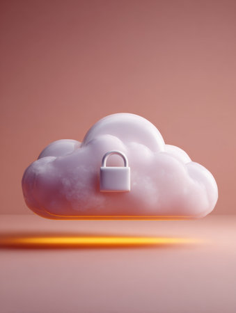 A 3D representation of a cloud with a padlock symbolizes data security in a calm pastel environment, suggesting protection and privacy online.