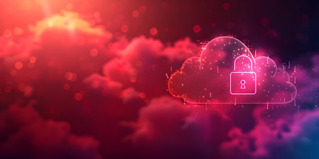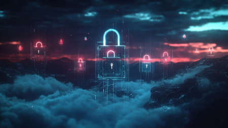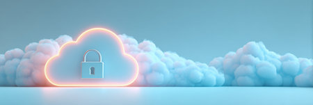 A luminous digital cloud featuring a lock symbol floats above soft, billowing clouds filled with vibrant particles. This captivating visual represents security in the virtual realm, emphasizing the importance of data protection.