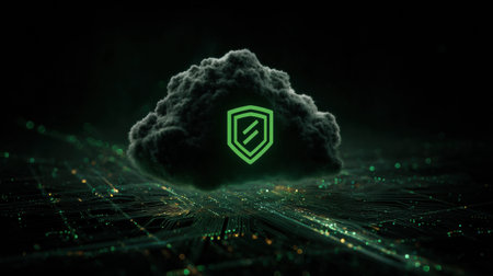 Secure cloud network protecting data with cybersecurity shield icons glowing in dark digital landscape evoking trust and protection