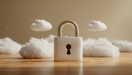 A white padlock is the central focus, positioned on a wooden surface with fluffy cloud formations. The composition employs soft lighting and a warm color palette. This digital illustration conveys concepts of security and data protection, making it suitable for various commercial uses.