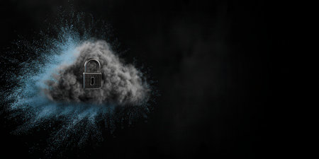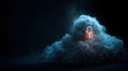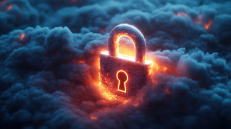 A visual representation of cloud security featuring a lock surrounded by mist and smoke. This image symbolizes protection and privacy in digital technology.