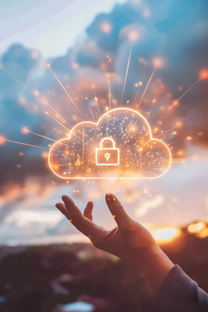 Cloud cybersecurity lock cloud security concept with glowing data network protecting digital storage and privacy