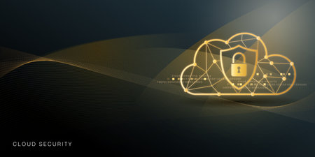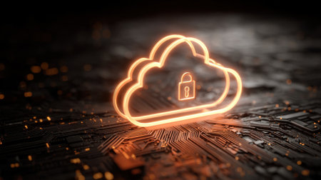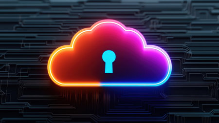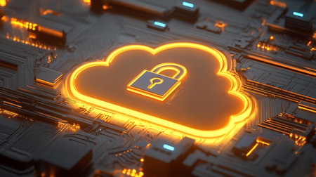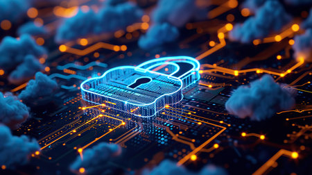 A luminous cloud symbol with a lock appears against a dark circuit board background, representing cybersecurity and data protection. The glowing design highlights technology themes.