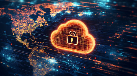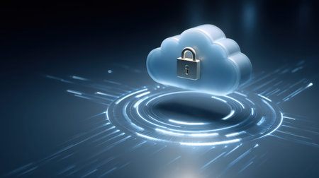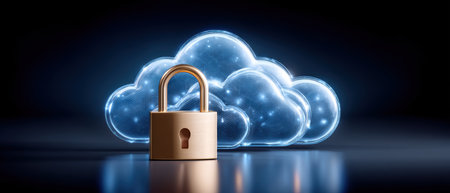 Digital cloud storage security concept with locked cloud symbol and glowing data streams representing online data protection and privacy management