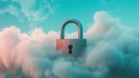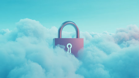 Visual representation of cloud security featuring a padlock symbolizing data protection, surrounded by soft clouds and a serene blue background.