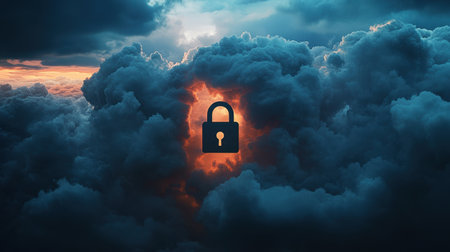 Thick clouds part to reveal a padlock symbol, highlighting cloud security and the protection of online information